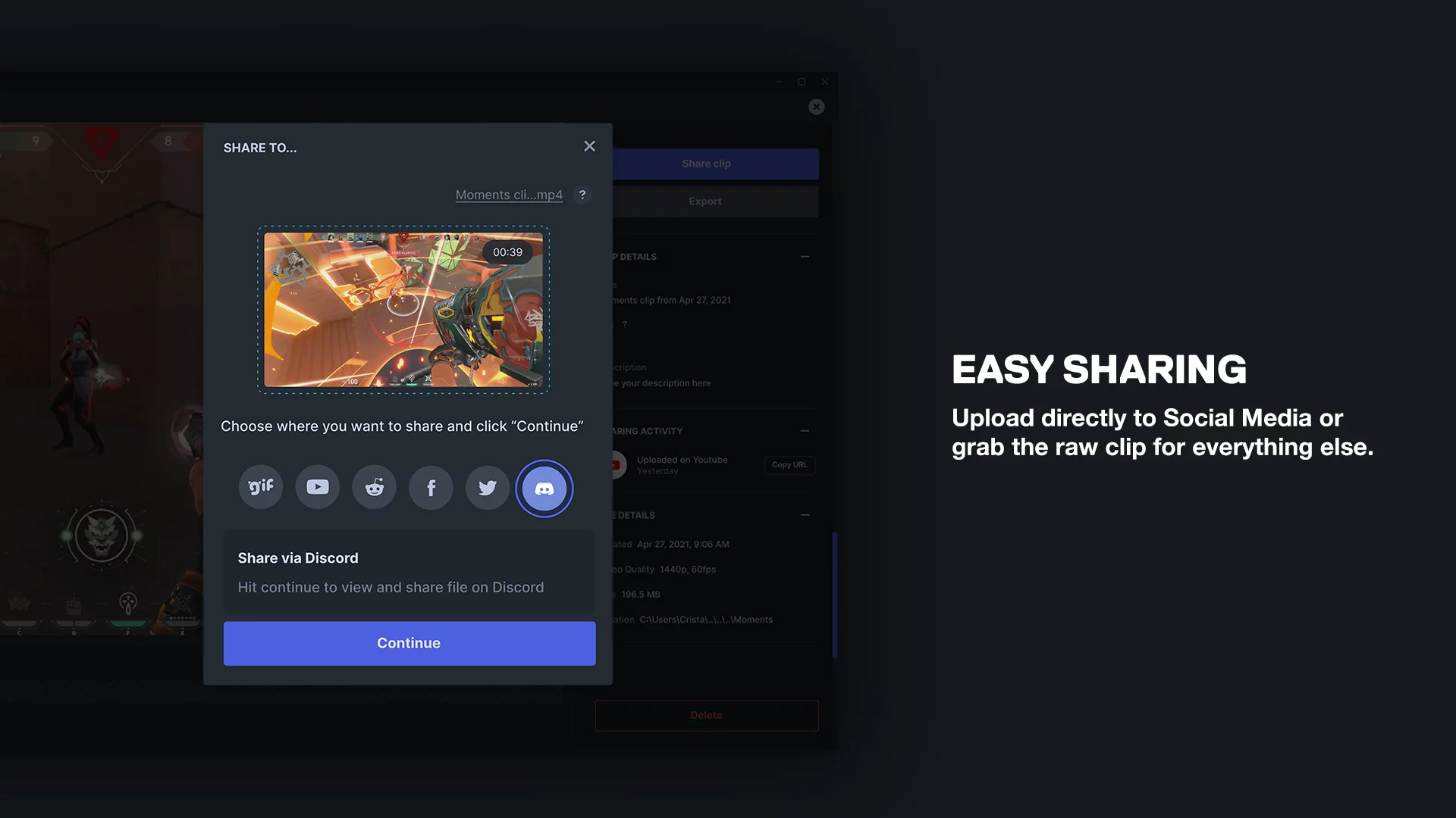 - Megosztás – Hogy a megosztás könnyű legyen, a Moments lehetővé teszi a játékosok számára, hogy klipjeiket közvetlenül a YouTube-ra és a Gfycat-re töltsék fel. A további lehetőségek közé tartozik az egyszerű drag and drop megosztás más csatornákon vagy közvetlen üzenetekben (DM) a Discord, a Reddit, a Twitter és a Facebook felületén, és hamarosan további platformokon is.