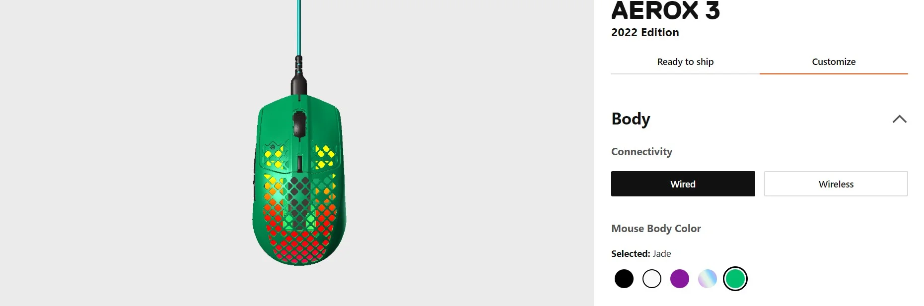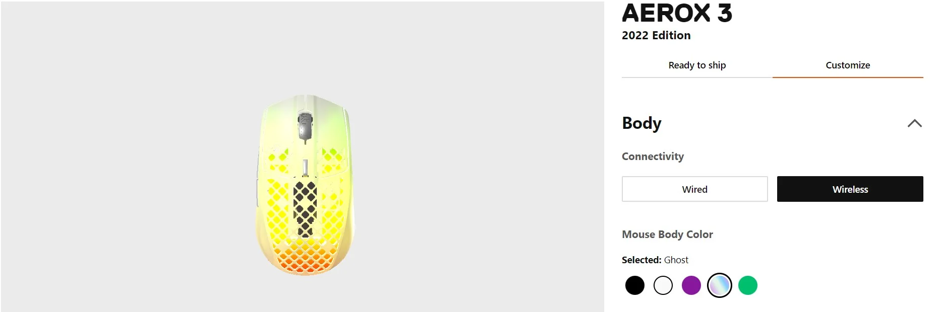Az Aerox 3 egerek ezentúl 5 különböző színben lesznek elérhetők: Onyx fekete, hófehér (Snow), lila (Royal), áttetsző (Ghost) és jádezöld. A korábbi változatokhoz hasonlóan az új modelleknél is adott a 3 zónás PrismSync világítás, amely az egér alsó részén, illetve a méhsejtrácsos vázon átszűrődve is látható.