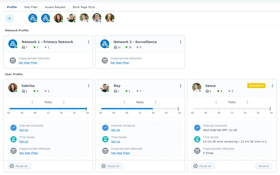 A felhasználónkénti profilok úgy is konfigurálhatók, hogy korlátozzák az online töltött időt, vagy blokkolják a böngészést az adott feltételek teljesülésekor. A megegyező profilokhoz rendelt eszközök ugyanazon internet-hozzáférési szabályokon fognak osztozni anélkül, hogy ismétlődő konfigurálást kellene végezni manuálisan. A felhasználókhoz nem tartozó eszközök esetében – amelyek továbbra is internethozzáférés-vezérlést és auditálást (pl. vendég vagy új eszközök) igényelnek – hálózat specifikus profilok is elérhetők.
